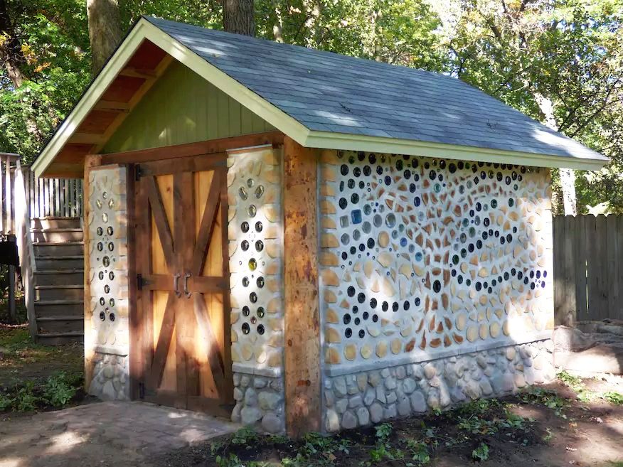 One of the easiest ways to make your cordwood “pop” is to use recycled glass bottles. A wine bottle taped together with a canning jar gives that stained glass effect. Folks are starting to use colored bottles on both sides of the wall which gives color to the exterior as well. Others are using embedded LEDs to bring the wall to life after dark. [Click here for more.]